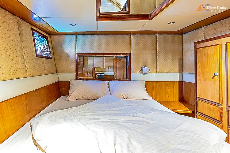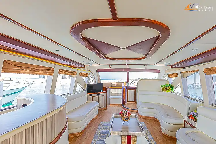 The 80 ft yacht offers luxurious bedrooms with elegant furnishings, stylish washrooms, a BBQ station, and a premium music system. While the interiors showcase Italian craftsmanship with parquet wooden floors and cream-colored furniture, the exteriors exude elegance and offer breathtaking views. Guests can relax in the air-conditioned lounge, enjoy gourmet meals, and watch Dubai’s spectacular midnight fireworks at Dubai Marina, Burj Al Arab, and Atlantis- The Palm, from the spacious open deck.