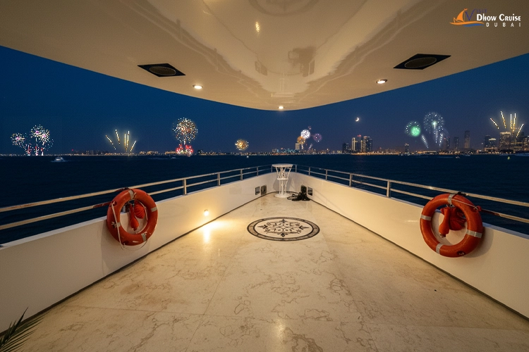 As the yacht sets sail from Dubai Marina, the evening begins with a lavish buffet featuring international dishes and gourmet bites fresh from live cooking stations. The open bar keeps your glass full while the DJ spins the perfect soundtrack for the night. The decks are wide open for you to walk around, dance, or simply relax and take in the amazing city views. As midnight gets closer, the excitement builds. From your spot on the yacht, you’ll have the best view of Dubai’s spectacular fireworks lighting up the sky from every direction.